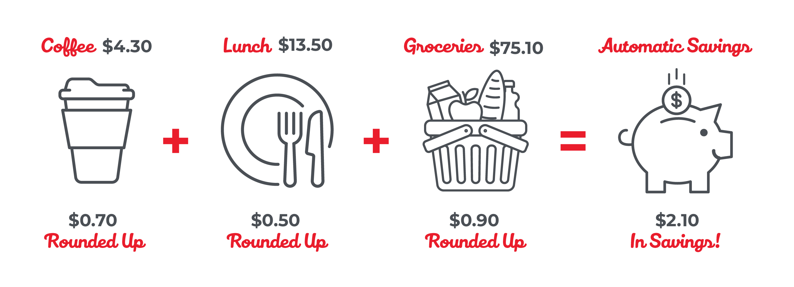 So, if you buy lunch for $7.43, we round it up to $8.00. The extra $0.57 is automatically deposited into your savings. If you bought this lunch every day, this would add up to $3.99 a week and $207.48 per year!